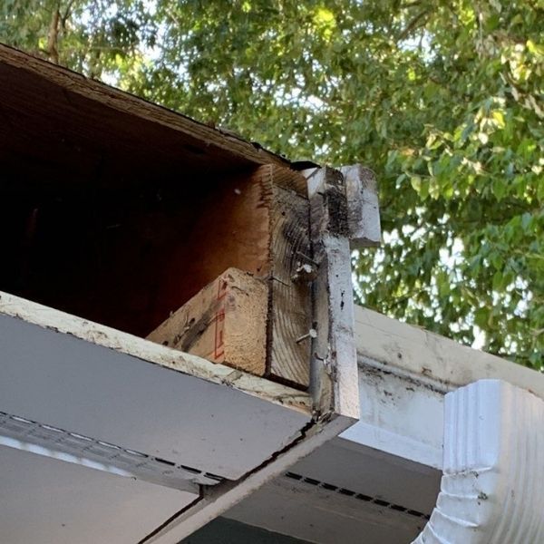 Water infiltration and clogged gutters led to visible wood rot along the roof edges.