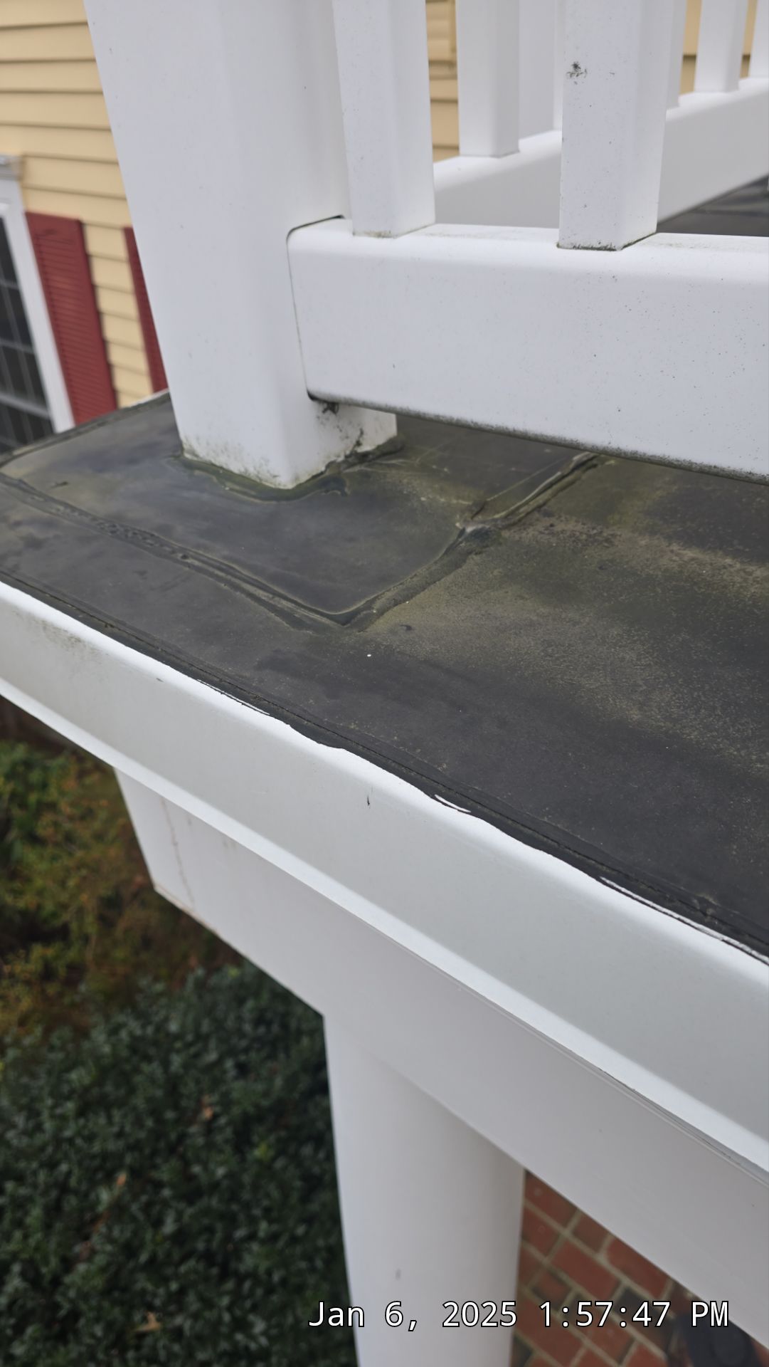 - The top of the porch roof was covered in a rubber roof material, and the seams on this material demonstrated signs of leakage – particularly near the outside corners of the porch where the rooftop railing penetrated the roofing.