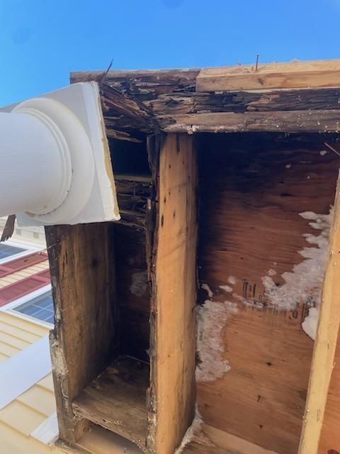 - Removal of the trim under the porch roof revealed significant rot in the perimeter beams as well as suspected mold.