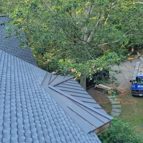 comprehensive replacement plan tailored to this home’s unique needs. Our goal was not just to fix visible problems but to deliver a roof system designed to last for decades. And a key compontent of this strategy was not just to simply replace the existing asphalt shingles, but to apply a multi-material approach using both ashpalt and metal roofing. Each material would be used where it was best suited: asphalt on the higher-pitched areas and metal roofing on the lower-pitched areas where the debris and snow tended to accumulate.
