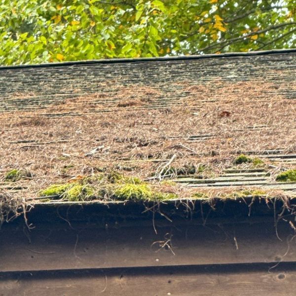 heavy debris buildup, including leaves, pine needles, and moss. This trapped moisture and caused rot in the roof’s structure. Many shingles were cracked, warped, and missing protective granules, while other components like ridge vents and boot pipes had deteriorated beyond repair.