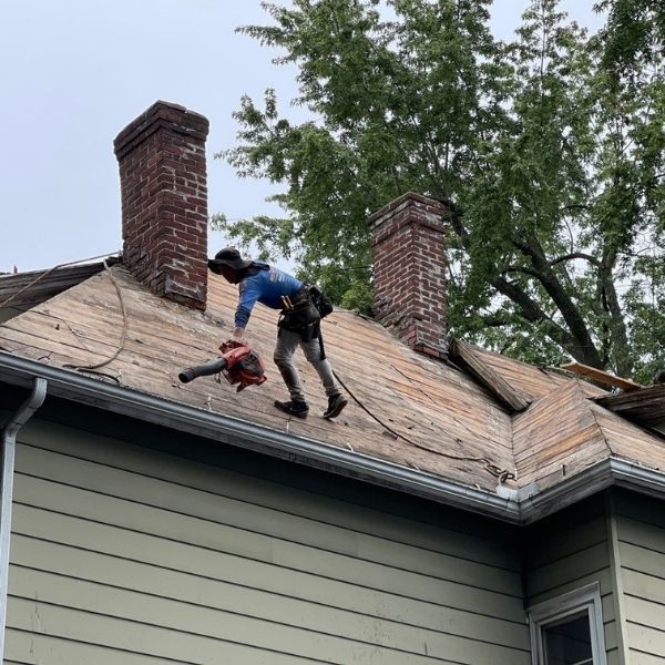 All existing shingles and underlayment were removed to expose the original plank decking.