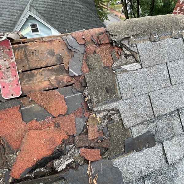 Master Roof completed a full roof replacement on a historic 1894 home in Springfield, Massachusetts. The existing roofing system had suffered storm damage, flashing failure, structural decking gaps, and code compliance issues. After inspection, it was clear the roof required immediate replacement — not just new shingles, but structural upgrades to meet current Massachusetts building code. This project involved emergency protection, full tear-off, decking reinforcement, flashing corrections, gutter adjustments, and complete system replacement.