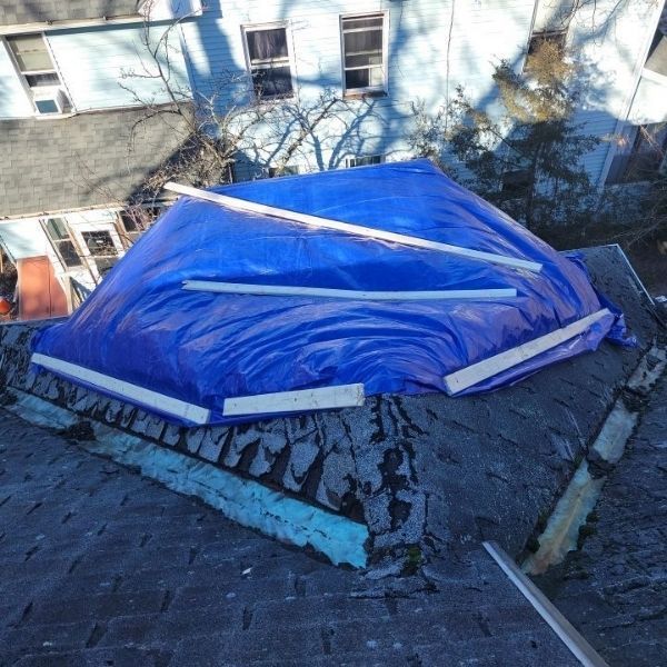 Inspection revealed missing shingles in multiple sections of the roof. A temporary tarp had been installed to prevent water intrusion. The roof was at risk of further water damage and required urgent replacement.